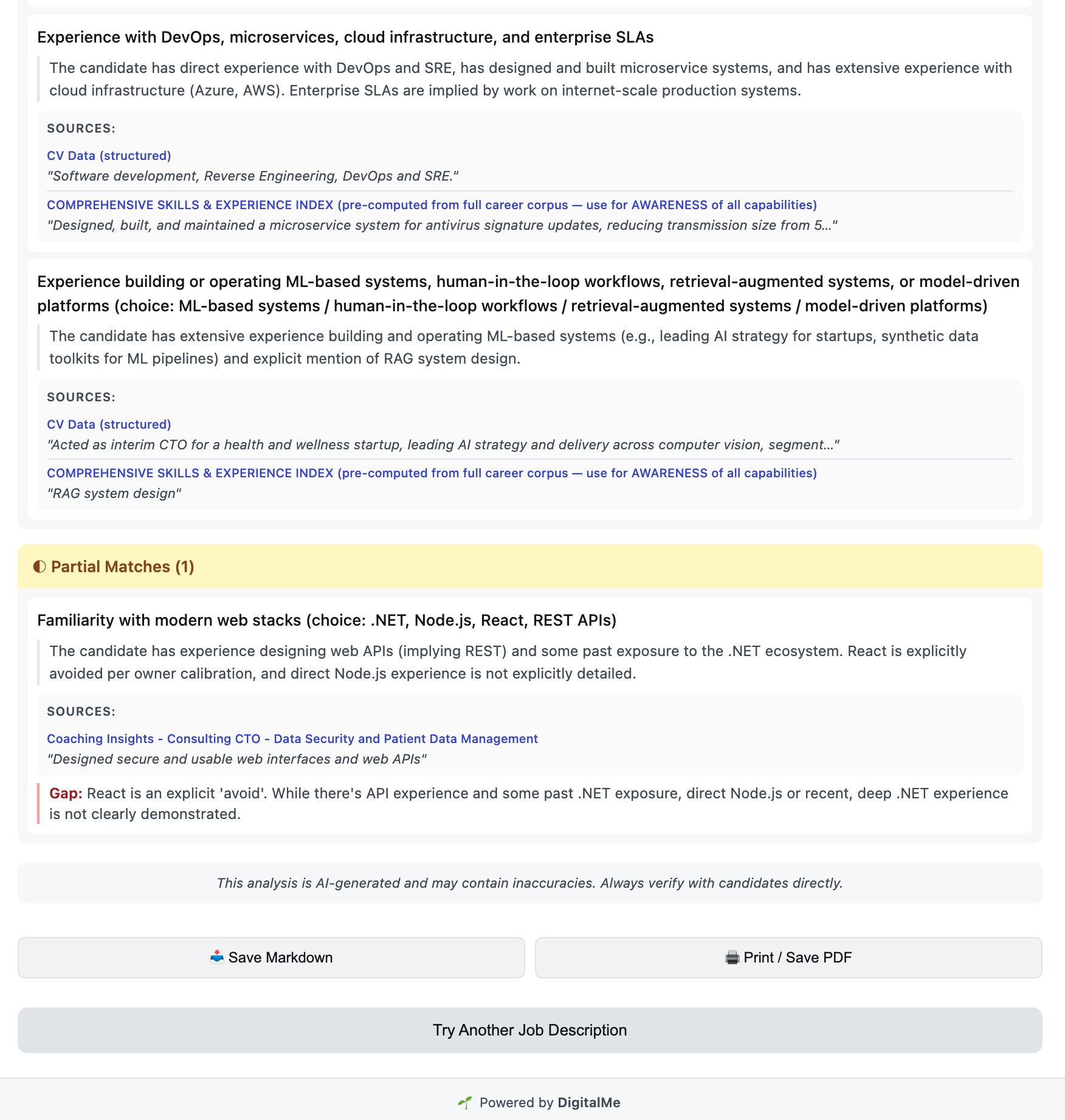 A visitor pastes a job description. The system extracts requirements and searches across all registered professionals using a multi-stage matching process.1 The result is a ranked list of candidates with detailed breakdowns: strong matches, partial fits, and gaps — each backed by cited evidence.